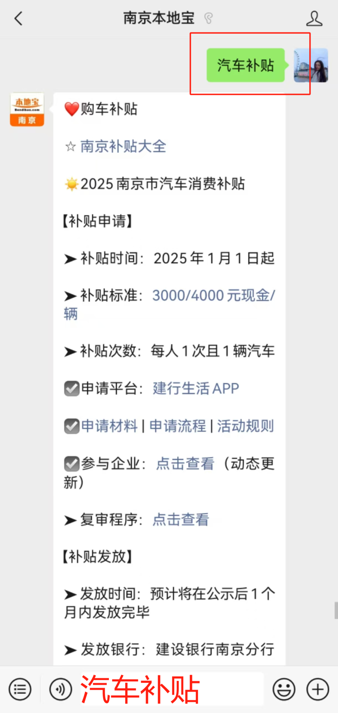 提醒:关注南京本地宝,后台对话框回复【汽车补贴】获取,南京现有购车补贴申请入口、申请指南、活动门店等;