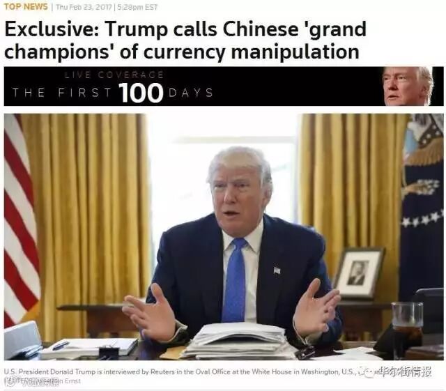 在接受路透的独家采访时,特朗普声称虽然他没有像此前承诺的那样在就任第一天宣布中国为“汇率操纵国”,但是他依然没有改变对中国“操纵汇率”的看法。我认为它们就是操纵汇率的‘总冠军’,我没有改变看法,让我们等着看吧。