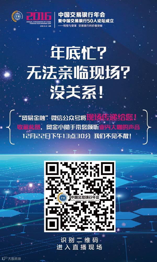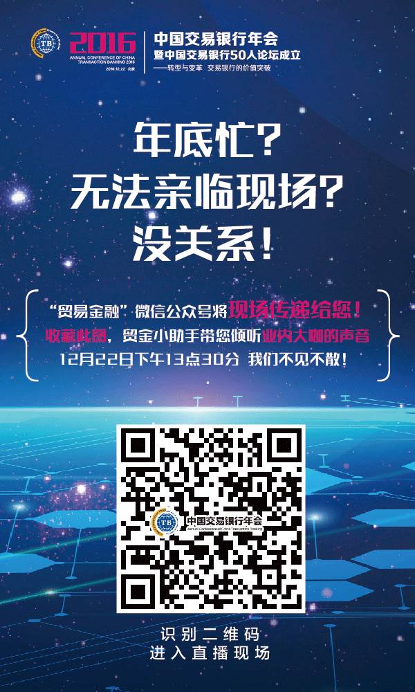 详情请继续关注《贸易金融》杂志、中国贸易金融网、“贸易金融”微信公众号的后续报道,众多干货,继续为您呈现!还可扫描以下直播二维码,年会详情,实时跟进!
