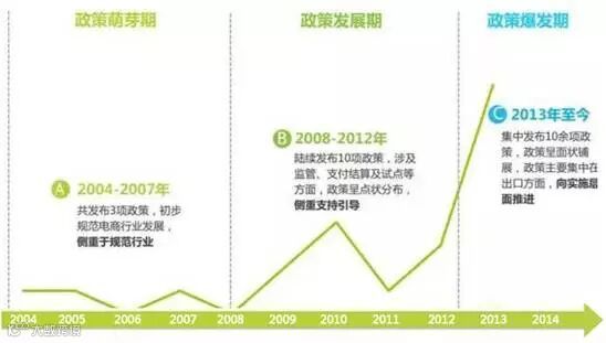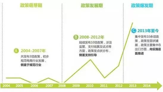 2004年以来跨境电商发展政策经历三个阶段,支持力度不断加大。