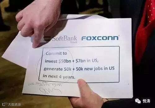 消息是软银创始人孙正义先捅出来的。他老兄跟美国当选总统川普先生聊嗨的时候出示了一份联合投资“承诺书”:软银和鸿海承诺在未来4年在美国本土投资570亿美元,创造10万个就业岗位。其中鸿海集团投资70亿美元。