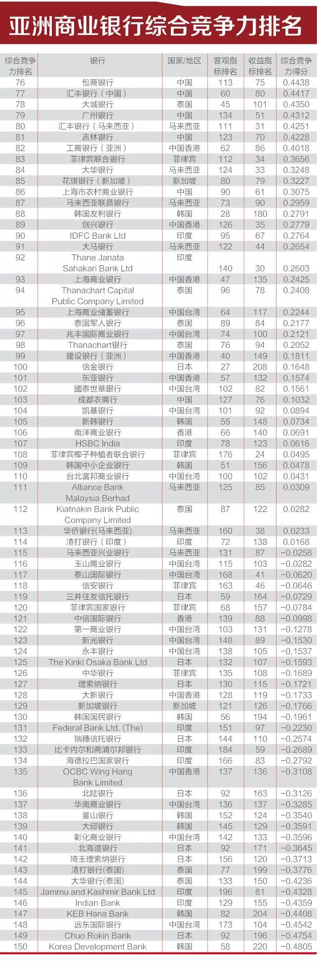 基于综合指标因素,对亚洲10个国家(地区)的229家银行的竞争力作了排名。