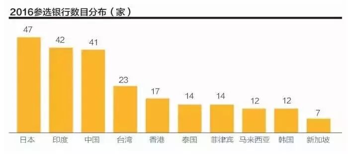 中国内地银行首次占据了亚洲排名前四位。另外,进入前15名的银行还包括2家中国香港的银行、1家日本的银行、1家泰国的银行、1家印度的银行。