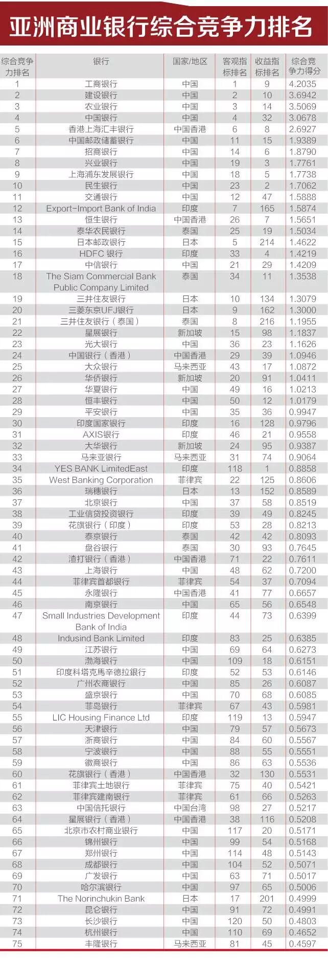 其中,中国工商银行保持了综合竞争力、客观指标两项第1名的位置,收益指标位于第9位;中国建设银行综合竞争力第2名,客观指标第2名,收益指标排名上升到第10位;中国农业银行综合竞争力第3名,客观指标第3名,收益指标上升到14名。香港上海汇丰银行综合竞争力排名第5名,客观指标排名第6名,收益指标排名第8名;中国邮储银行综合竞争力排名第6位,客观指标排名第11名,收益指标排名第15名;招商银行综合竞争力排名第7名,客观指标排名第14名,收益指标排名第6名。收益指标排名第一的银行为印度的 YES BANK Limited,其综合排名位列亚洲第34位。(编辑:闫沁波)