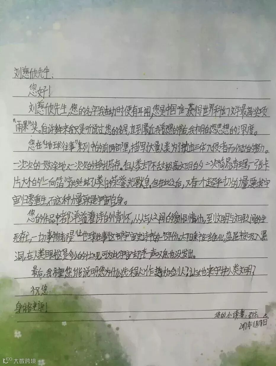 因为喜欢科幻,他给偶像刘慈欣写过一封信: