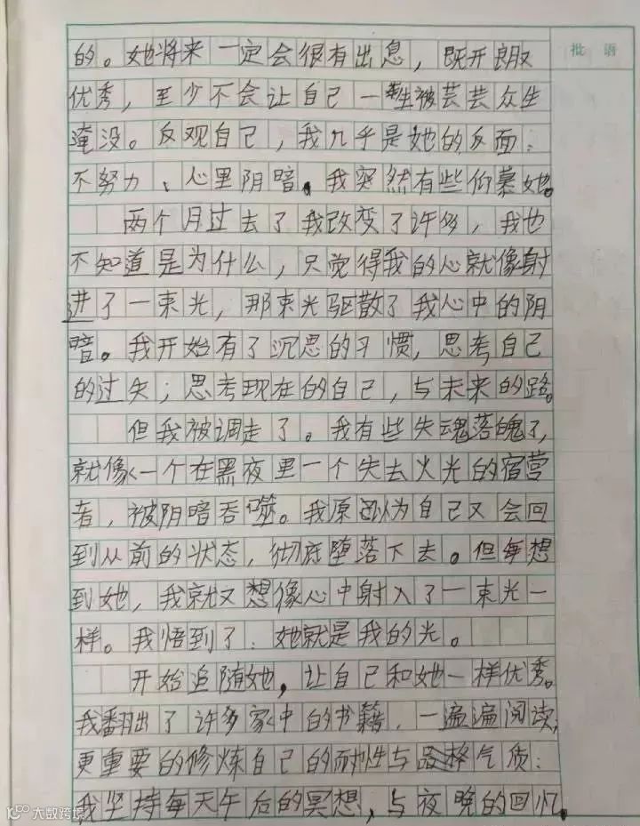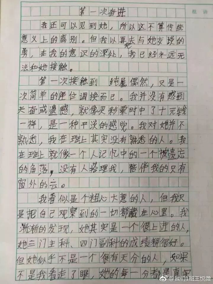 这篇作文在王老师的微博晒出后,迅速走红,短短几个小时,已收获1万评论、5万转发和10万点赞,并被许多微博大V争相转发。