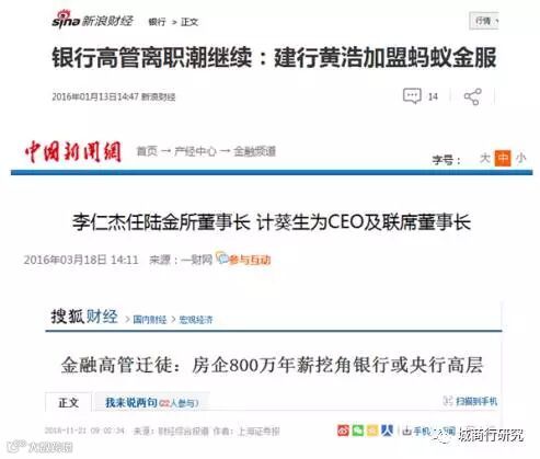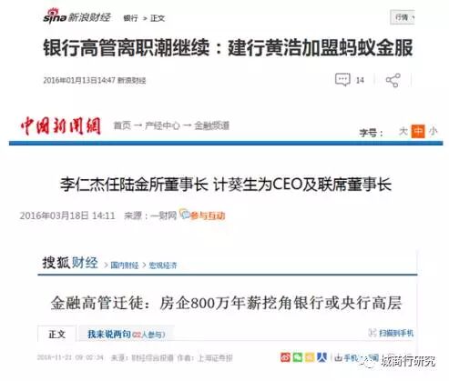 值得注意的是,银行高层级的跳槽,大多流向与银行有着一定竞争关系的互联网金融公司、民营银行。如,曾任兴业银行行长14年的李仁杰退休后加盟了陆金所担任董事长;原华夏银行副行长黄金老将担任民营银行苏宁银行行长;前光大银行资产管理部总经理张旭阳加盟百度任副总裁;华夏总行前理财处长吴志坚加盟玖富集团任副总裁兼首席资产管理官;原建设银行网络金融部总经理黄浩加入蚂蚁金服,后任网商银行行长;……
