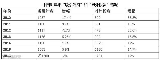 下面是最近几年中国吸引外资和对外投资的数额,单位为亿美元。2016年吸引外资的美元数据,是我根据官方公布的人民币数据推算的,其他数据都是官方公布的正式数据。