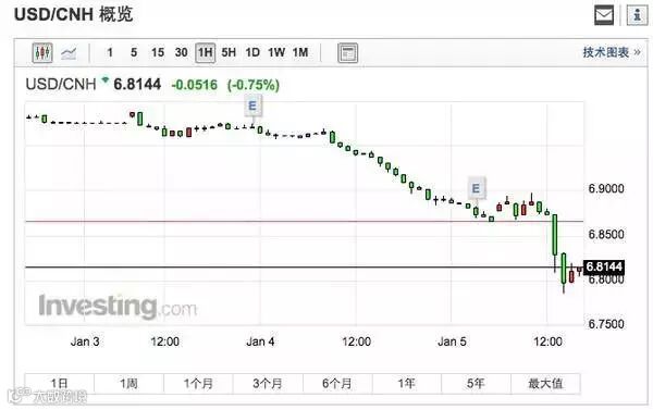 午后,离岸人民币兑美元升破6.8关口,现报6.8144,连破5大关口,收复多处失地。从1月3日到5日,人民币对美元最低点到最高点,涨幅近2000点。