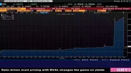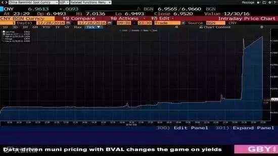 (2016年12月28日晚间彭博客户端“有问题”的在岸人民币/美元汇率行情图截屏)