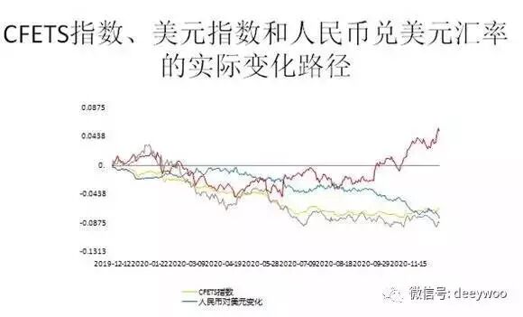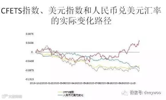 CFETS到底是怎么变化的,跟哪些因素有关?我们现在要考虑三个变量,人民币对美元的汇率、CFETS指数、美元指数,这三个变量之间是有关系的。如果人民币对美元汇率贬值,美元指数也下跌,那么CFETS一定是下降的。如果人民币对美元贬值,美元指数上升,CFETS可能升也可能降,取决于人民币对美元贬值的相对幅度,这是我们得出的结论。这个结论实际上是重要的,这是实际所看到的三个变量的变动路径。