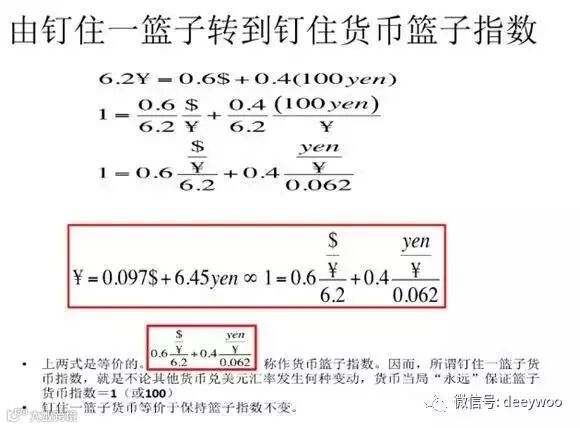 以上两个等式是等价的。左边以篮子货币来表示的,右边以篮子货币指数来表示的。右边这个等式的右边称作货币篮子指数,货币篮子指数等于多少?现在还不知道,你得知道了它们的汇率之后才知道,这就叫做篮子汇率指数。所谓钉住一篮子货币指数就是无论其他货币对美元汇率发生何种变化,货币当局永远保证篮子货币指数等于1或者100。钉住一篮子货币等于保持篮子货币指数不变或者钉住一篮子货币指数,这俩说的是一件事。
