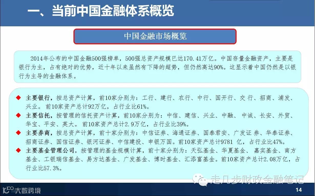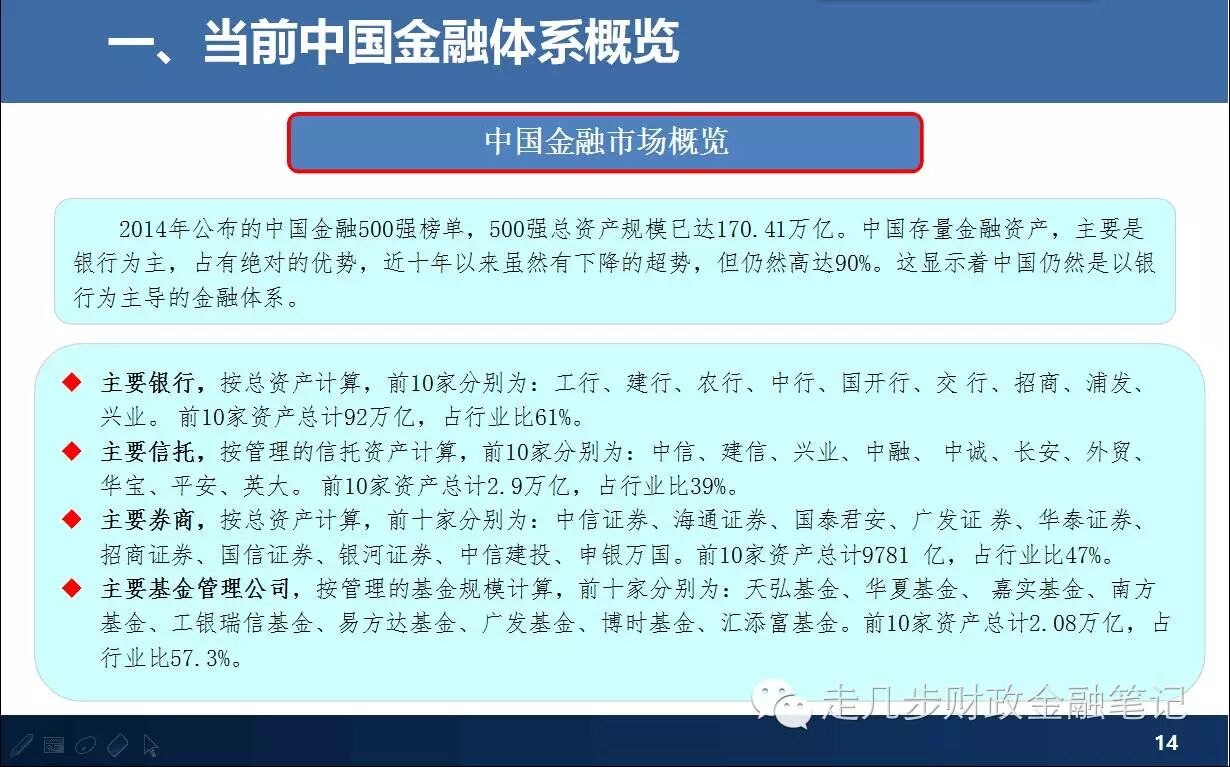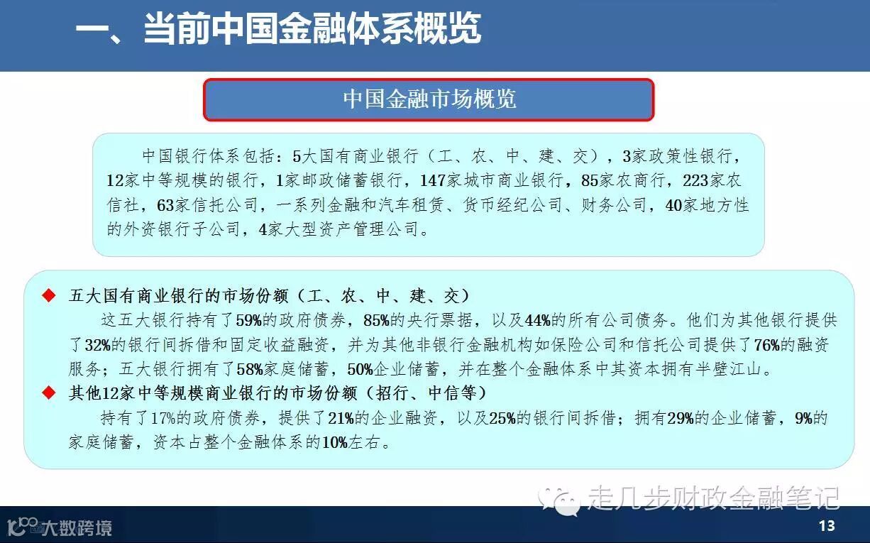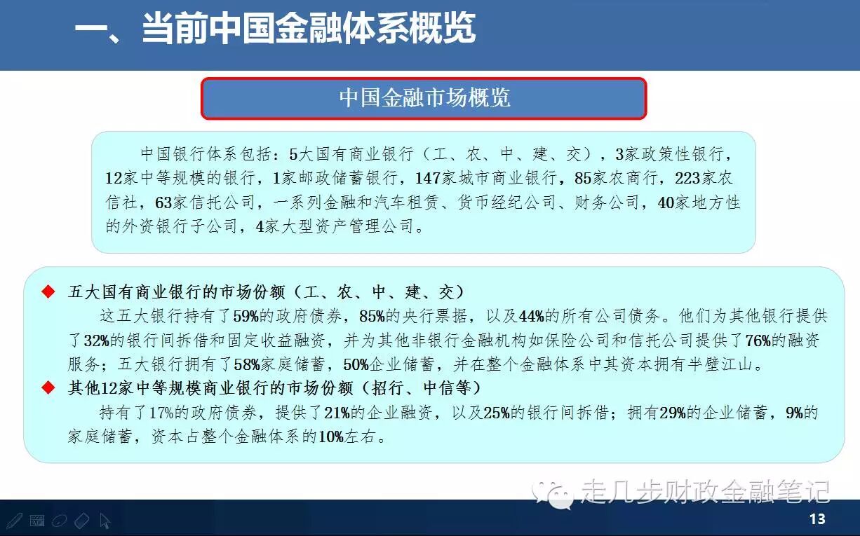 《当前中国金融体系》是一年前为了某次讲座准备的课件的部分内容,现在回过头来看,这些基础的东西还是没有变。对于整体性了解中国的金融环境、金融体系、金融政策有一定的帮助。以下是课件节选: