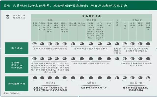 广义的交易银行业务主要包含支付结算、现金管理和贸易融资三类,各类产品都颇具吸引力(参阅图4)。其中,支付结算和现金管理两类业务由于本身的特点,往往紧密相连,形成一个服务组合。此外,根据各家银行自身的情况,还会涉及企业的卡业务、与贸易相关的资本市场产品(利率、汇率合约)等业务。
