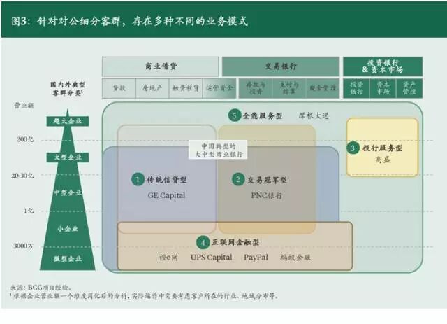 从发展路径看,上述五大模式以产品的差异化为核心竞争力,同时在客群覆盖上各有侧重。首先,绝大多数银行是从服务大中型企业的传统信贷需求起步,匹配自身的存款业务。其次,银行根据自身企业客户由交易衍生的多元服务需求,开发交易银行业务的产品组合,拓展服务范畴,建立交易冠军型模式。下一阶段,公司银行往往需要面对拓宽客户类型的选择:部分银行选择投行服务模式,建立公开市场融资、并购顾问等复杂需求的服务能力,覆盖超大企业客户;部分银行选择互联网金融模式,以低成本覆盖小微企业客户。最终,部分领先银行在上述信贷业务、交易业务、投行业务和互联网金融业务中的多个领域形成专业专长,覆盖多个类型的客群,打造全能服务模式(参阅图3)。