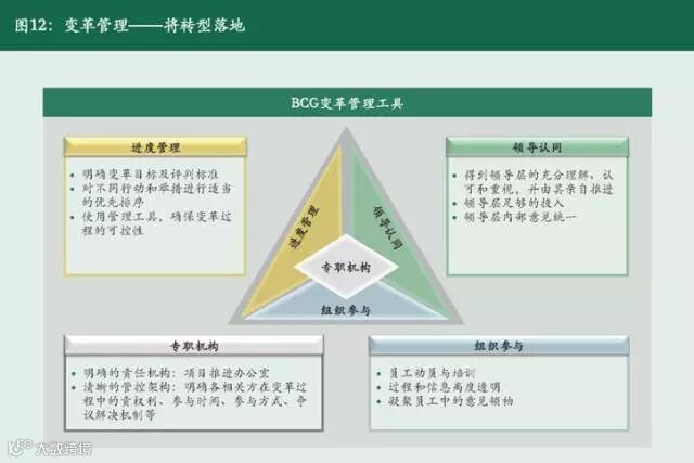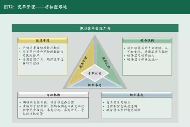 从公司银行需建立的前七大能力能够看出,公司银行的转型并不是从无到有的重建,而是需要在尊重和有效利用现有资源的基础上进行改变和创新,但在这个过程中也难免需要推翻一些已有的理念和实践。因此,必须在转型中处理好传统与创新、存量与增量之间的关系。BCG的变革管理工具围绕转型落地的主题,提出变革管理的四大杠杆:专职机构、进度管理、领导认同、组织参与(参阅图12)。