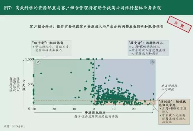 例如,以每单位资金投入所产生的净风险收入和每单位存款所消耗的银行资源为考量维度,分为给予者、接受者和消耗者等三大类(参阅图7)。“给予者”是银行资金的创造者,以较低的成本为银行获得了较多的资金,且消耗资本少,同时贡献了较好的收入,对于公司银行有战略价值。“消耗者”与之相反,消耗资源较多,但是收入贡献较低,银行应审视其吸引力,适当降低其优先级乃至舍弃。“接受者”一方面消耗较多的银行资源,另一方面贡献较多的收入,是银行可合理发展,保持稳定增长的客群。通过采取更严格的客户组合管理流程,将紧缺资源部署在更具有吸引力的领域,并舍弃其他吸引力较低的领域,从而击败竞争对手。
