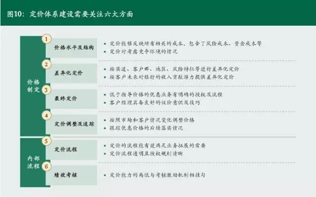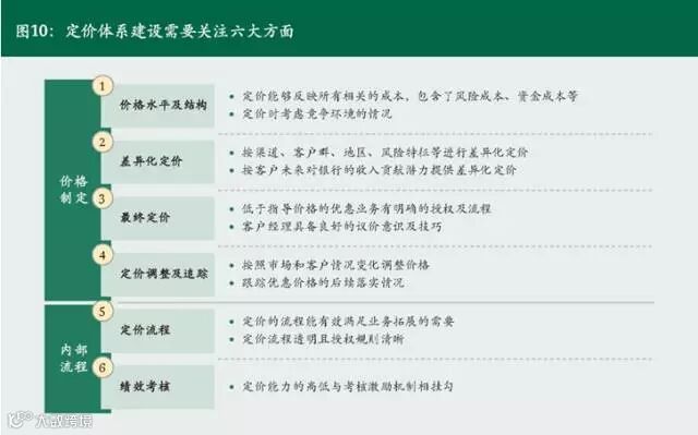 第五,定价流程。银行对于不同程度的折扣,订立完整的审批权限和审批流程,确保价格制定的标准化、透明化。