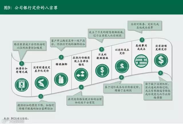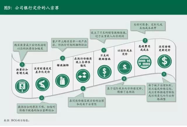 第四个抓手是基于价值的定价。根据BCG的全球观察,商业银行在定价的过程中通常会犯这样几个错误,我们称之为“八宗罪”(参阅图9)。