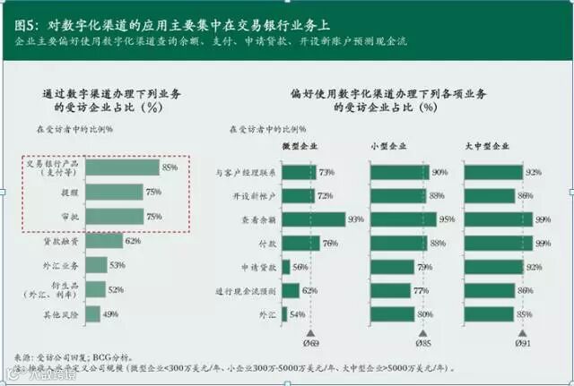 第三,在前端,以数字化产品和服务提升客户体验。BCG的一项调研发现,在所有通过数字渠道办理的业务中,交易银行相关的支付、提醒和审批处理的客户接受度最高,均超过70%。另外,企业规模越大,对使用数字化渠道办理交易银行业务的偏好则越高,如大中型企业在与客户经理沟通、查询余额、付款、申请贷款等环节的数字化偏好均超过90%(参阅图5)。