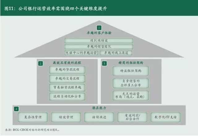 BCG在针对两百多名银行高管的调查研究中发现,100%的高管认为“运营卓越”是关键的竞争要素,但是许多公司银行目前仍在追求运营卓越的过程中挣扎,不到一半的受访者认为其银行已经明确定义了运营卓越的愿景。当前许多公司银行最大的运营卓越的缺口在于端到端的流程,比如贷款周转时间、开户时间和客户经理销售时间等。如果能够进行流程优化,不仅可以节省成本,更可以提升用户满意度,对银行得益甚大。