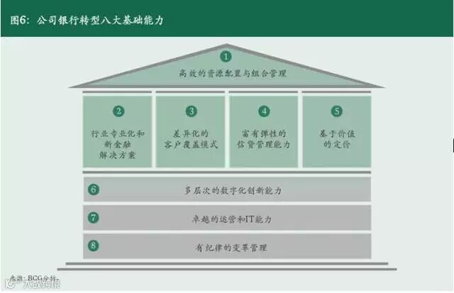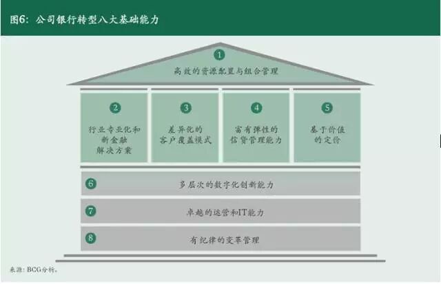 不管选择以上哪一种模式作为转型方向,制胜的公司银行业务都离不开一系列基础能力,具体包括:高效的资源配置与组合管理、行业专业化和新金融解决方案、差异化的客户覆盖模式、富有弹性的信贷管理能力、基于价值的定价、多层次的数字化创新能力、卓越的运营和IT能力,以及有纪律的变革管理(参阅图6)。
