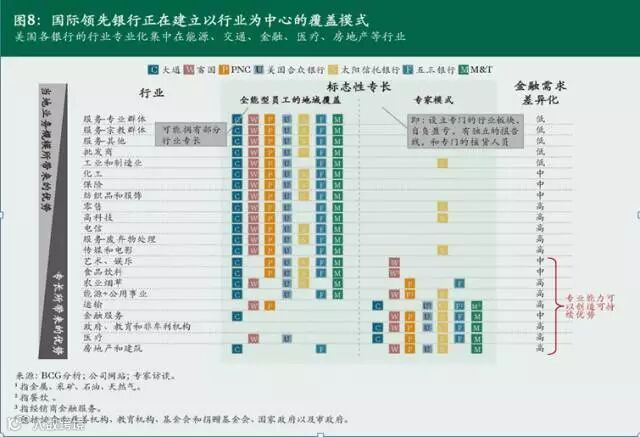 一是招募行业专家。例如美国俄克拉荷马银行针对当地能源行业为支柱的现况,招募了 30名能源业务板块的分析师和2名石油工程师,以充分理解和满足客户的需求。