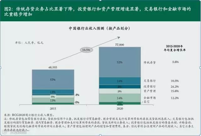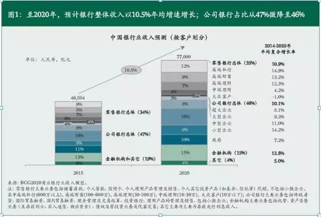 公司银行业务是传统银行业务中的基石,其资产、收入、利润贡献都达到行业的一半。聚焦中国银行业收入池,预计银行业总体收入将从2015年的4.7万亿元人民币上升至2020年的7.7万亿元人民币,年均复合增速10.5%。其中,受到中国经济结构调整、多层次资本市场发展和企业“去杠杆”等多方面的影响,公司银行业务收入占比预计将从2015年的47%微降至2020年的46%;绝对值预计从2015年的2.2万亿元人民币上升至2020年的3.5万亿元人民币。公司银行仍为整个银行业的第一大收入来源,增长主要来自中型、小型企业客户,以及交易银行、投资银行等业务。