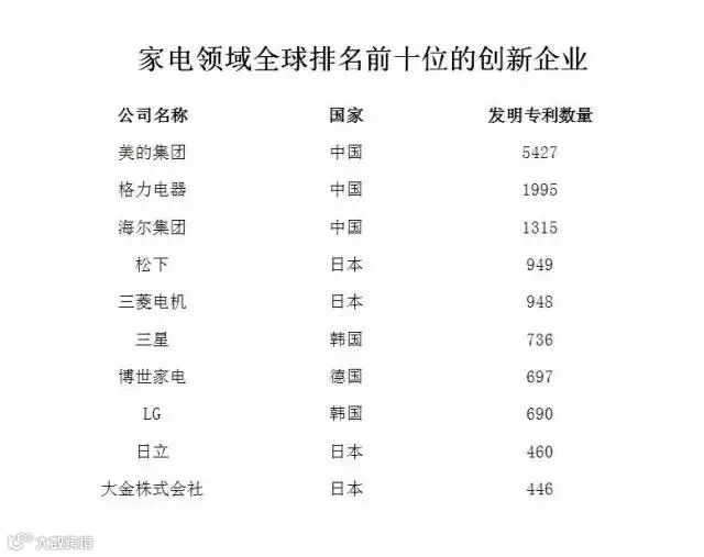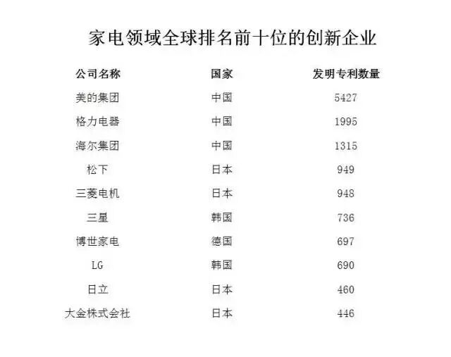 汤森路透发布的《2016年全球创新报告》显示,中国科研正在进入创新时代,不仅是科研机构,企业表现更加突出。以家电行业为例,排名前三甲的创新企业均来自中国,分别是美的、格力和海尔。从发明专利数量来看,美的以5427个专利数量遥遥领先。