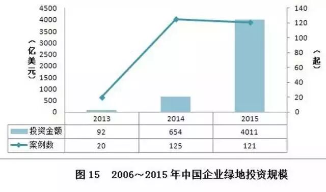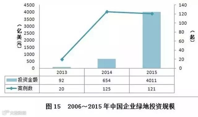 相对于跨国并购,中国企业在海外的绿地投资数目相对较少,但是投资金额超过海外并购金额,主要是劳动密集型和资源密集型企业选择在欠发达或是发展中国家进行投资,以获得原材料和劳动力。在“一带一路”战略构想下,中国企业投资非洲多以绿地投资为主。另外,正在寻求转型升级的“中国制造”把目光投向德国,继2014年之后,再次成为在德绿地投资项目数量第一的国家。根据德国联邦外贸与投资署的数据,与2014年相比,2015年中国在德投资项目数量增长了37%。