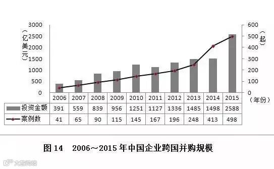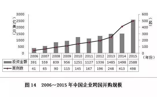 从投资方式来看,根据CCG收录的2000~2016年上半年中国企业对外投资2858起案例,跨国并购案例数为2515起,占总案例数的88%,可见跨国并购成为中国企业对外投资的主要方式。从2006年起,中国企业跨国并购案例数直线上升,2015年再创历史新高,达到498起(如图14)。