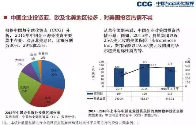 从单个国别来看,中国企业对美国投资热情不减。根据CCG的统计,2015年中国企业在美国投资案例129起,投资总金额达到482.67亿美元,与2014年相比分别同比增长了24%和94%。2016年截止到上半年,中国对外投资的近20%都投入到了美国。