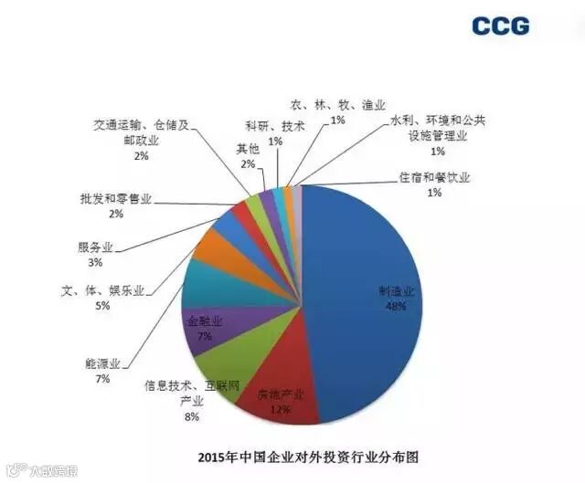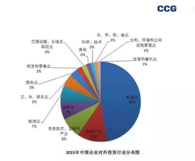 从投资行业分布来看,2015年中国企业海外投资制造业占比48%,接近总投资额的一半(如图16)。中国企业正通过投资不断向价值链上游延伸并扩大全球版图,增强国际竞争力。