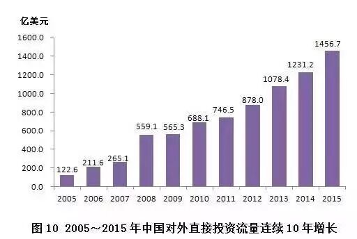 自2005年以来,中国对外直接投资流量连续10年持续增长,2015年达到了1456.7亿美元,是2005年的13倍多(如图10)。2016年是“十三五”规划开局之年,1~6月我国对外非金融类直接投资达到888.6亿美元,同比增长58.7%。中国企业对外投资迎来“黄金期”。