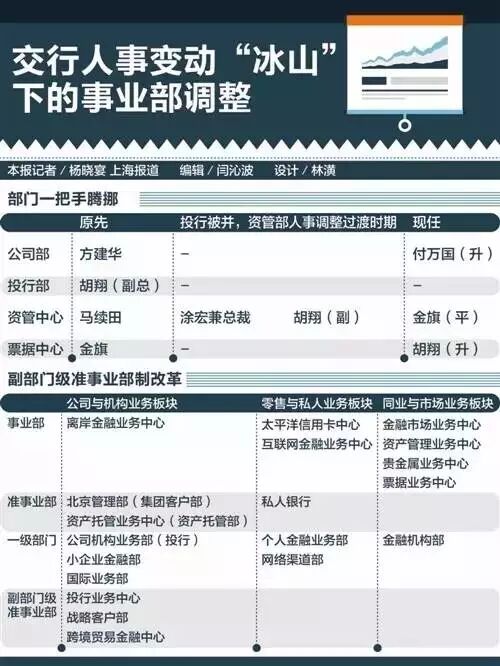 除个人原因,公司和同业板块的变化,背后实则牵动着交行新一轮机构和事业部调整。继投行部被并入公司部,交行正从公司业务板块切入,推动副部门级准事业部以及分行准事业部制改革。