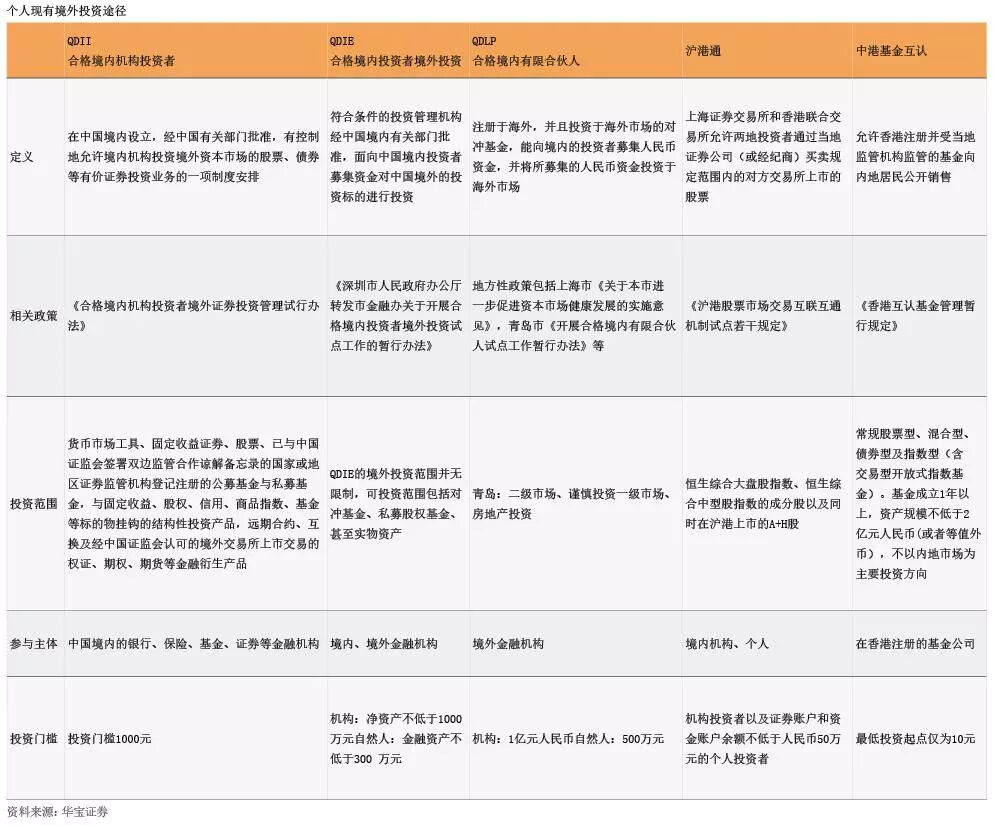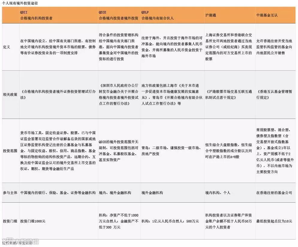 从发展趋势看,国内个人投资海外市场的渠道和范围正在不断拓宽。境内居民除可以通过购买合格境内机构投资者(QDII、RQDII)基金产品份额、参与“沪港通”交易投资境外证券市场外,还可选择QDLP、QDIE等。此外,通过“港股通”和中港基金互认,也可以投资香港股票和基金市场,加上刚刚落地的“深港通”,投资者投资境外金融市场的合法渠道越来越多(见附表)。