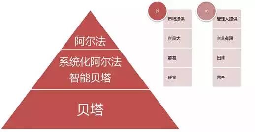 β工具的特点是市场容量大,获取较为容易,而且成本较低,比较常见的就是指数基金。α收益则是在β收益基础上的超额收益,例如通过积极管理相对于指数投资的超额收益。α的市场容量有限,对投资能力要求较高,因此积极型管理人会收取超额业绩提成。