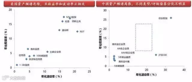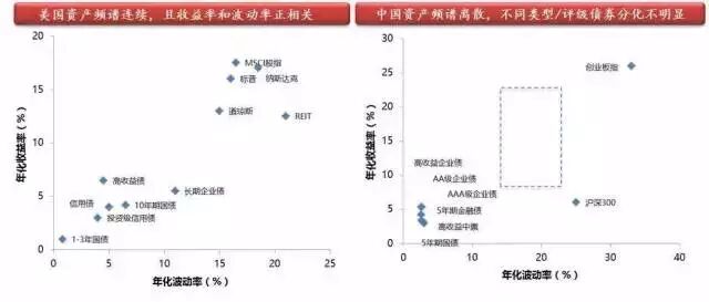 对比中美资产频谱,中国的资产频谱显得比较离散,收益率和波动率的相关性相对较弱,过去几年非标/信用债等信贷类资产在刚性兑付预期之下满足了投资者对中低波动、中高收益的单一资产投资需求.