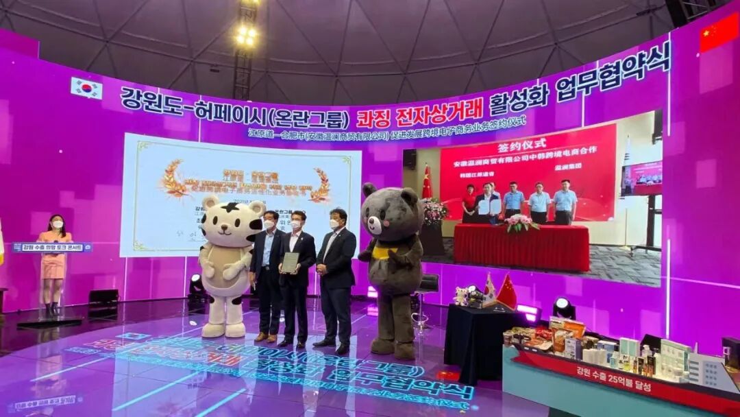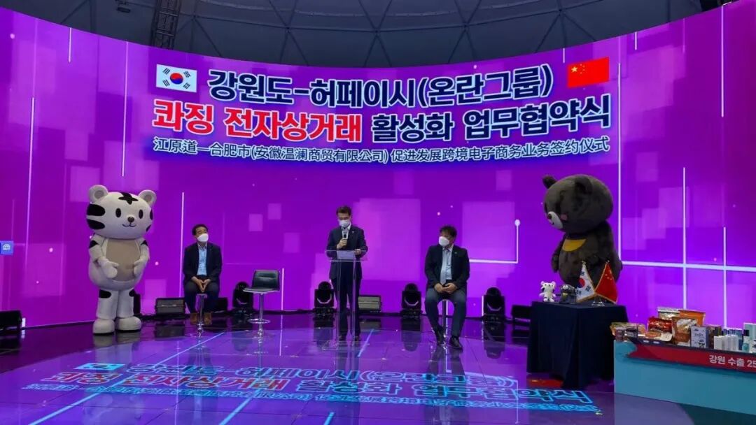 仪式上,中韩双方有关代表签署了多项合作协议。其中,温澜集团董事长袁斌与韩国江原道省知事崔文洵以云签约形式签署了《促进跨境电子商务活性化业务协议》,合肥市电子商务协会会长邓鸿与韩国江原道联网出口协会会长吴贞烈云签署了《促进跨境电商业务协议书》;安徽温澜商贸有限公司总经理马慧慧与合肥新站高新区现场签署了《温澜商贸中韩跨境电商贸易平台项目投资合作协议》。