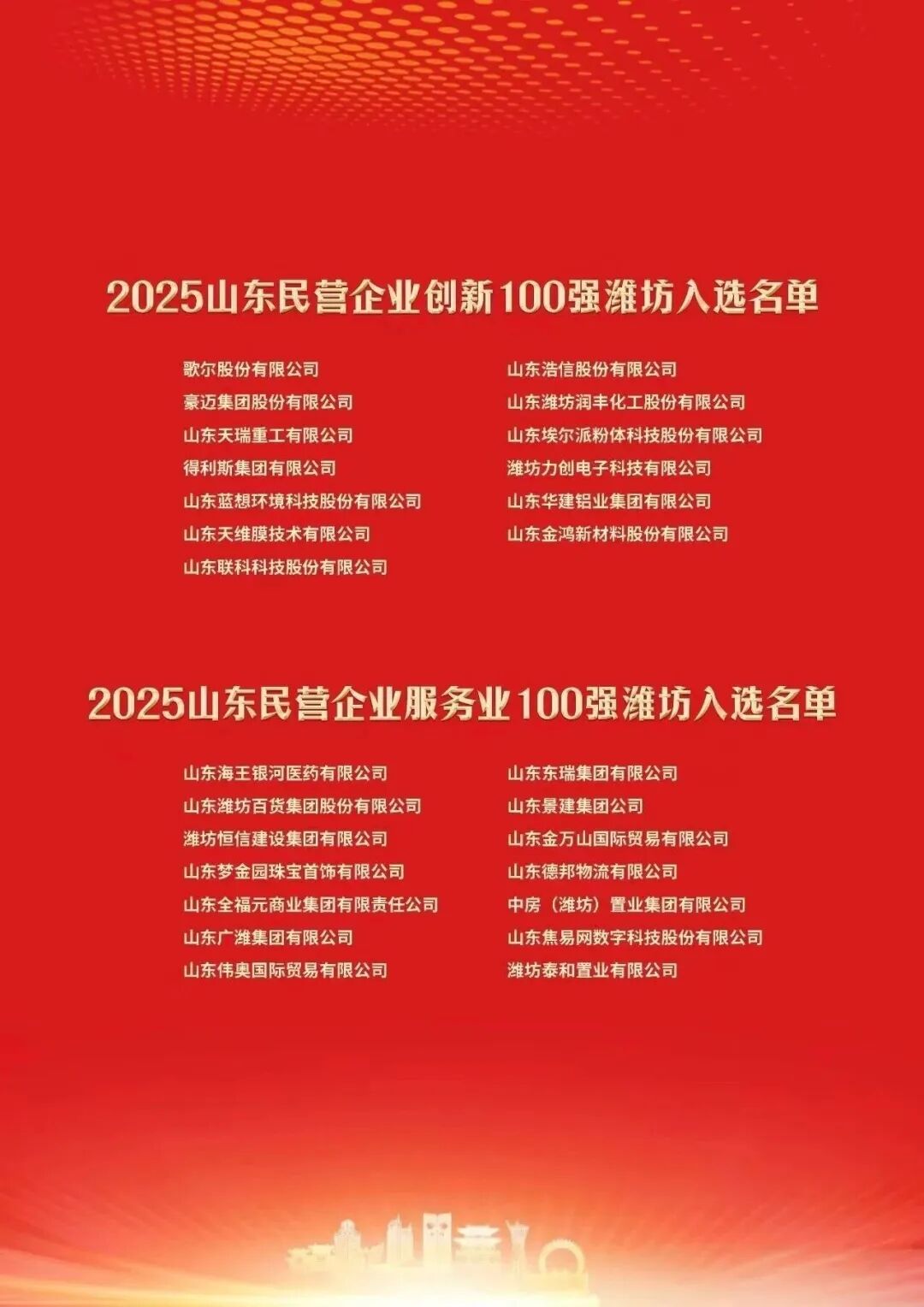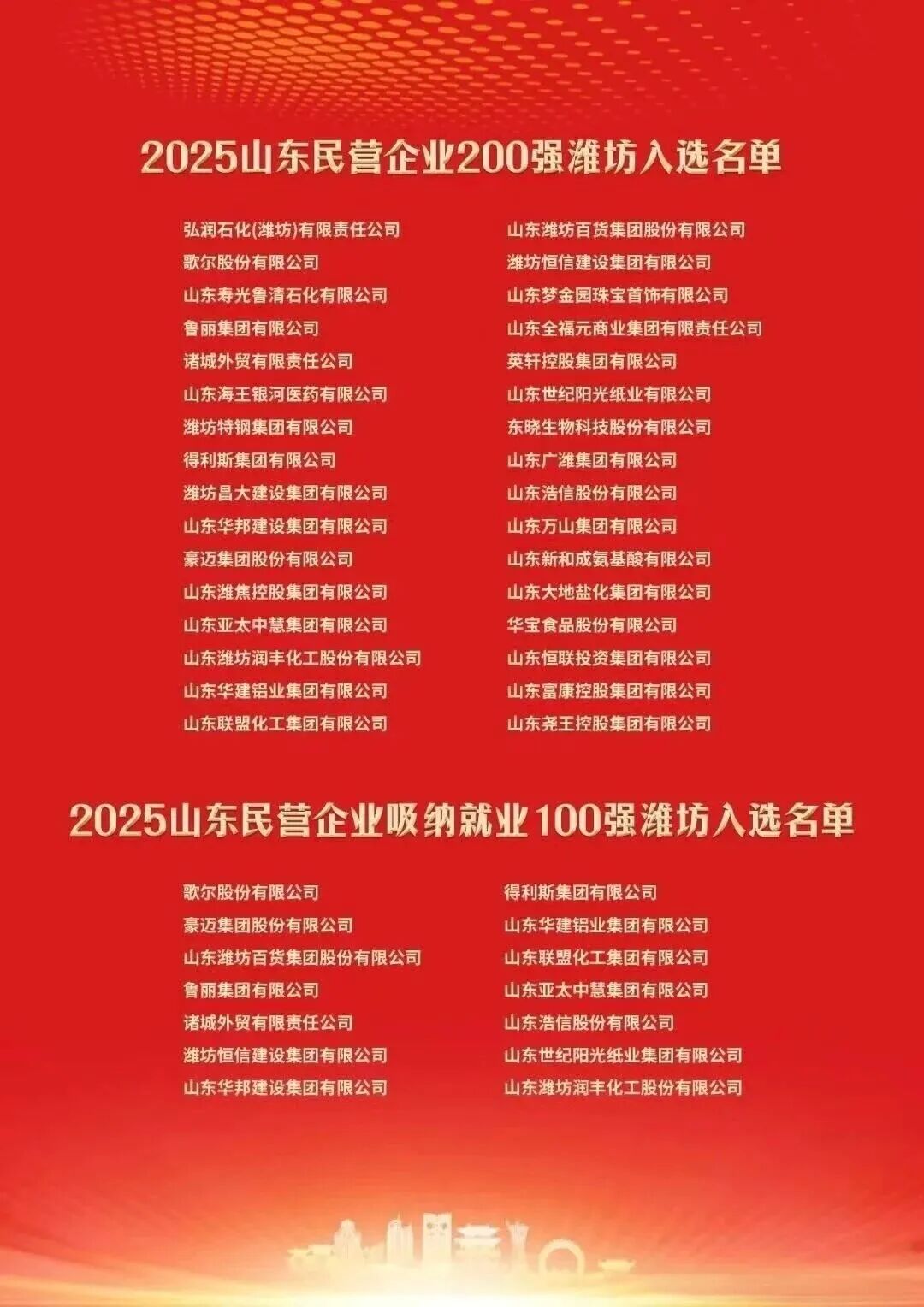 11月1日,潍坊市召开2025年全市企业家大会。会上宣读2025潍坊市50强企业名单,我市豪迈集团股份有限公司、 孚日集团股份有限公司、星宇安防科技集团股份有限公司等企业成功入选。大会同时还公布了2025山东民营企业创新及服务业100强名单、2025年山东民营企业200强、2025山东民营企业吸纳就业100强、2025中国制造业企业500强潍坊入选名单。其中我市豪迈集团股份有限公司入选2025山东民营企业创新100强企业名单、荣登2025山东民营企业200强企业名单、入选2025山东民营企业吸纳就业100强。会上,张恭运作为优秀企业家代表分享经验。