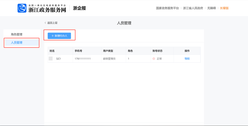 新增经办人,只有企业的法定代表人或者管理员账号才有权限操作对应账号登录系统后,首页点击“经办人管理”,如果只是一个普通的经办人账号,是看不到该模块的。点击“人员管理”,点击“新增经办人”,即可跳转到政务服务网人员管理模块,添加经办人,同时还能设置相关的权限。经办人添加完毕后,使用对应的经办人账号即可登录系统进行数据填报。
