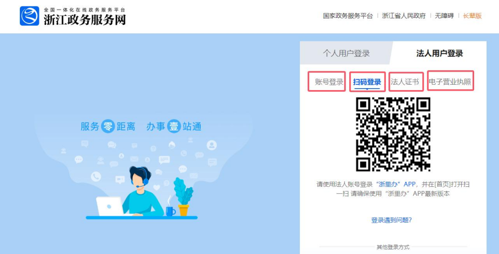 通过政务服务网法人账号登录(或法人账号授权过的经办人账号)、浙里办扫码、法人证书(e照通)扫码、电子营业执照扫码等方式登录。
