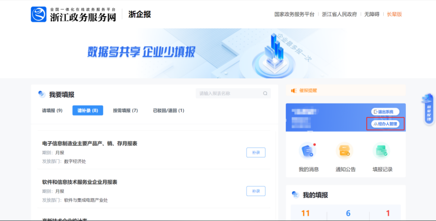 新增经办人,只有企业的法定代表人或者管理员账号才有权限操作对应账号登录系统后,首页点击“经办人管理”,如果只是一个普通的经办人账号,是看不到该模块的。点击“人员管理”,点击“新增经办人”,即可跳转到政务服务网人员管理模块,添加经办人,同时还能设置相关的权限。经办人添加完毕后,使用对应的经办人账号即可登录系统进行数据填报。