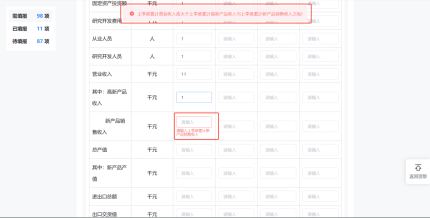 在“填报”页面可查看当前报表的期别、期号、发放部门、填报时间等信息,企业无需填写,只需核对即可。在企业填报过程中,需要确保数据真实有效且填写完整,若不满足,系统会进行提示,需补充修改后方可提交数据。