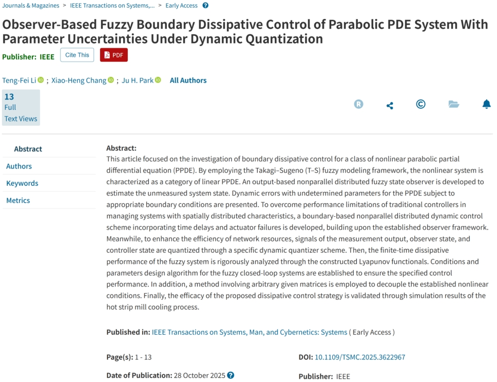 近日,佛山大学机电工程与自动化学院控制理论与控制工程团队在控制科学与工程领域权威期刊《IEEE Transactions on Systems, Man, and Cybernetics: Systems》上发表题为“Observer-Based Fuzzy Boundary Dissipative Control of Parabolic PDE System with Parameter Uncertainties Under Dynamic Quantization”的研究性论文,佛山大学机电工程与自动化学院为第一署名单位,李腾飞博士为论文的第一作者。该论文针对热轧带钢冷却等实际工业过程中存在的非线性、参数不确定、状态不可测等难题,提出了一种集成了模糊、状态估计、动态量化与边界控制的耗散控制方法。