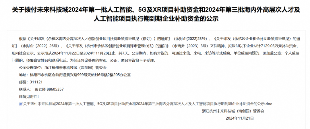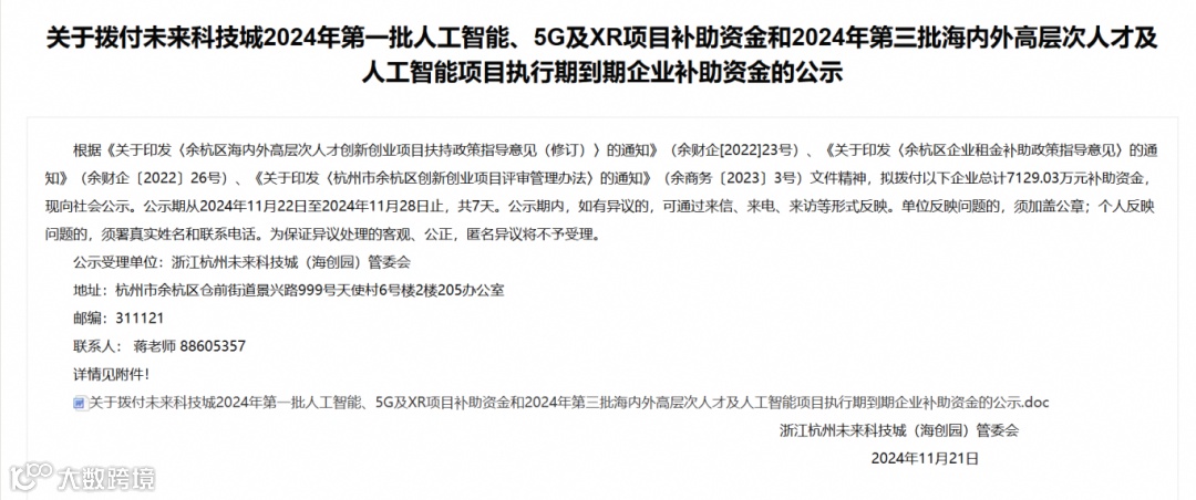 菜鸟智谷产业园入驻企业:杭州未斯科技有限公司、浙江五京科技集团有限公司、杭州背包智能网络科技有限公司3家企业成功获得2024年第一批人工智能、5G及XR项目研发及租金补助。