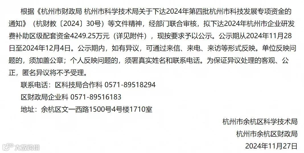 菜鸟智谷产业园入驻企业:杭州摩兽出行科技有限公司、杭州认养一头牛智能科技有限公司2家企业成功获得2024年杭州市企业研发费补助。