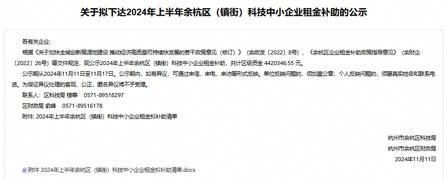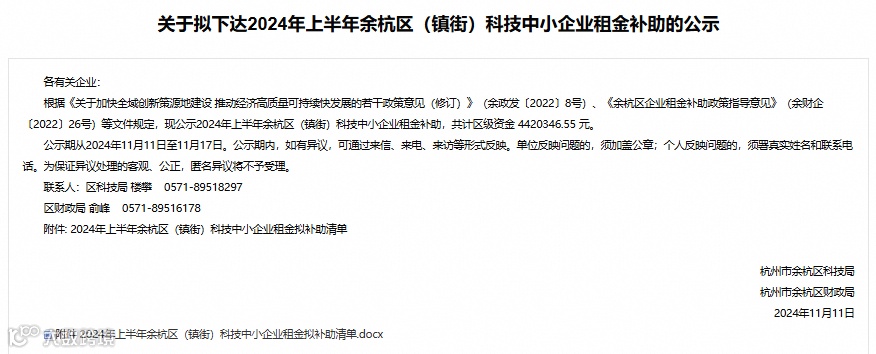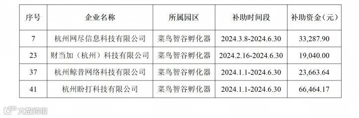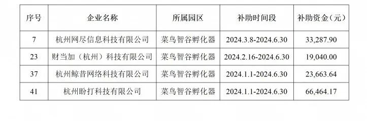 菜鸟智谷产业园入驻企业:杭州网尽信息科技有限公司、财当加(杭州)科技有限公司、杭州鲸昔网络科技有限公司、杭州盼打科技有限公司4家企业成功通过获得2024年上半年余杭区(镇街)科技中小企业租金补助。