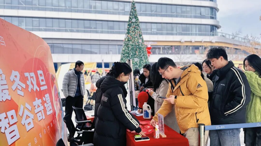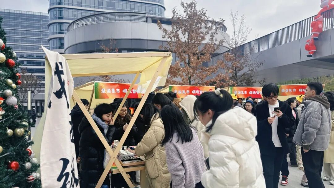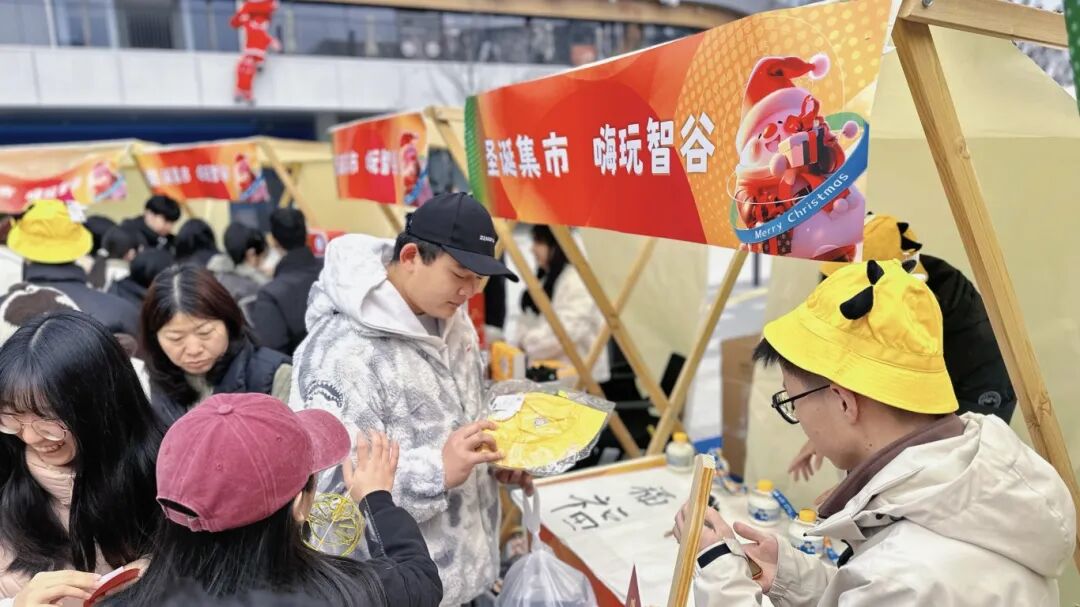 菜鸟智谷品牌企业认养一头牛、春江月、久适睡眠、氧泡泡、国文(阅读器)、HARZELN 、橙青珍珠等放出年终福利价,市集摊位前人潮涌动、年味十足。园区科技企业盼打的AI糖画打印机,更是吸引了不少人伙伴驻足体验3D打印的圣诞树、圣诞老人等趣味糖画,科技味十足。