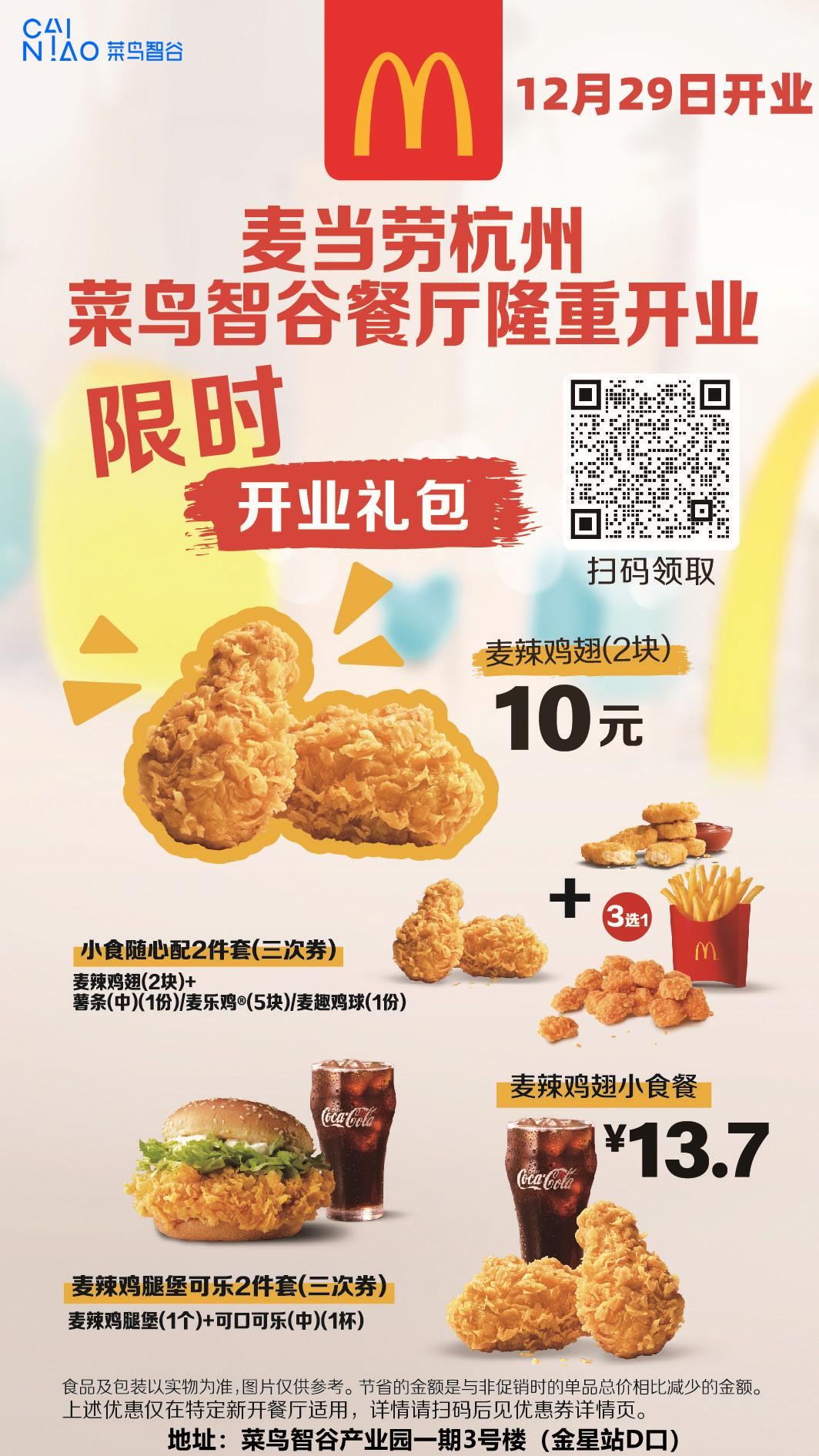 作为菜鸟智谷x麦当劳的首个联名旗舰店,开业优惠更是诚意满满。到店消费即有新店惊喜优惠礼包相送,新年将至,快来这里领取最好的时光奖励。